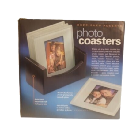 Brand New In Box - Looking for elegants and fun for gifts this holiday holiday? Display Your Cherished Memories With 4 Glass Photo Coasters And A Solid Wood Holder. These Elegant Coasters Hold A 2x3 Photo Thats Easy To Change And Has Non-Skid Pads To Protect Furniture. Brand New In The Box By Cherished Accents. Each Coaster Is 4x4.25. Perfect for showcasing your favorite photos while protecting your surfaces. Makes an amazing gift!