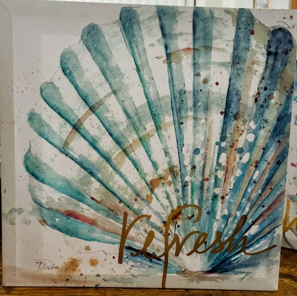 Never Used 2-in-1 Sea Shell Canvas Wall Decor light weight, average size. Put time together or seperated they make a beautiful addition in the home.